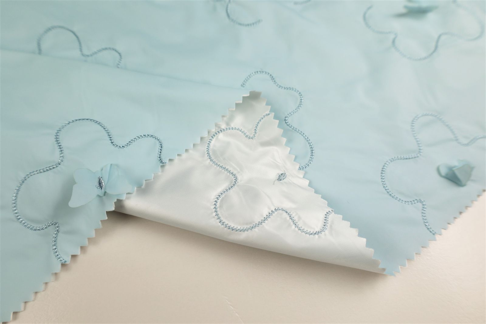 激光繡小花,加持夜光反光的蝴蝶作以點綴,花型立體,使面料賦有生機。